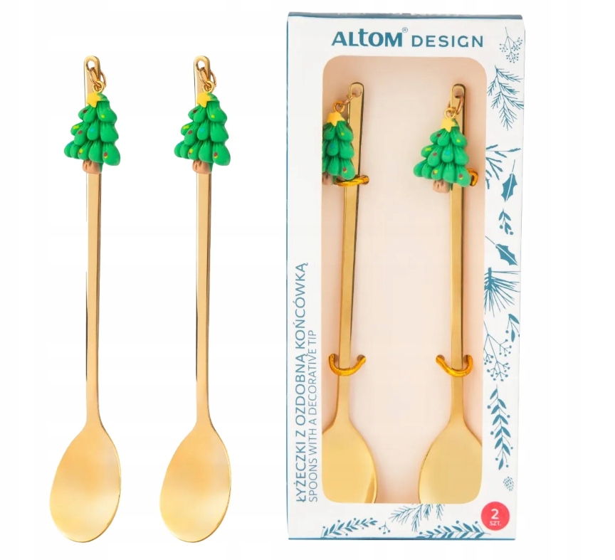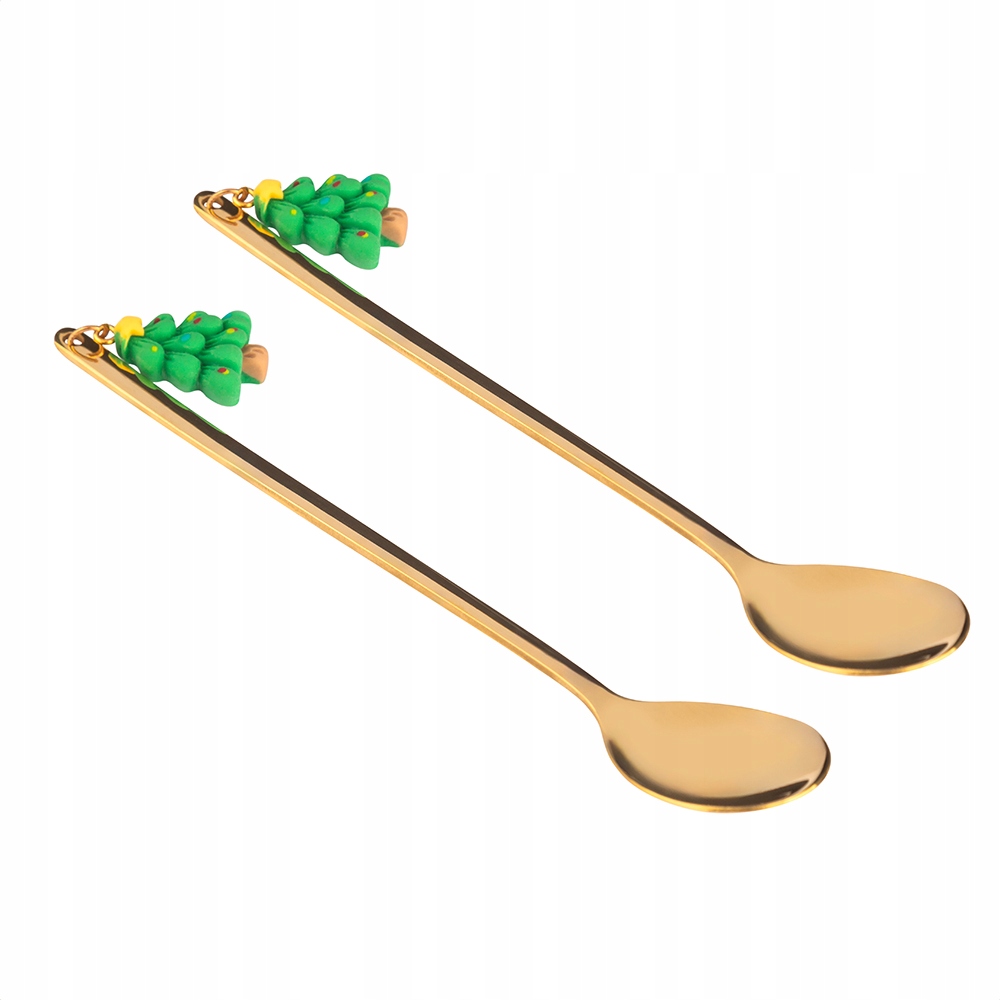 Komplet 2 ozdobnych łyżeczek z choinkami to stylowy dodatek, który wprowadzi na stół świąteczny nastrój. Złote wykończenie i dekoracyjne choinki na uchwytach tworzą elegancki akcent, idealny do serwowania kawy, herbaty, deserów czy świątecznych wypieków. Wykonane ze stali nierdzewnej, łyżeczki są trwałe, odporne na codzienne użytkowanie i wygodne w użyciu. Zestaw zapakowany jest w estetyczne pudełko, dzięki czemu świetnie sprawdzi się jako gotowy prezent na święta.
