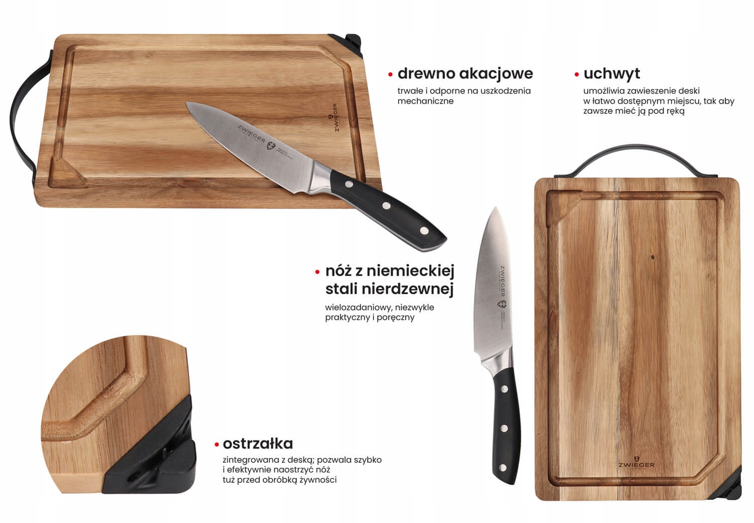 OPTIMA to praktyczny i funkcjonalny zestaw kuchenny, składający się z deski do krojenia z drewna akacjowego oraz wielozadaniowego noża z niemieckiej stali nierdzewnej. Idealne rozwiązanie do codziennych prac kuchennych, łączące trwałość, wygodę użytkowania i estetyczny wygląd.