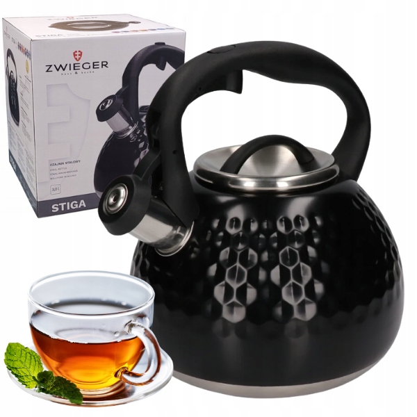 Elegancki czarny czajnik Zwieger Stiga 3L z gwizdkiem to idealny wybór do każdej kuchni. Wykonany z wysokiej jakości stali nierdzewnej, łączy nowoczesny design z funkcjonalnością.