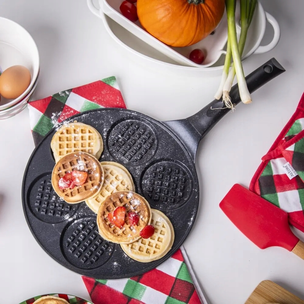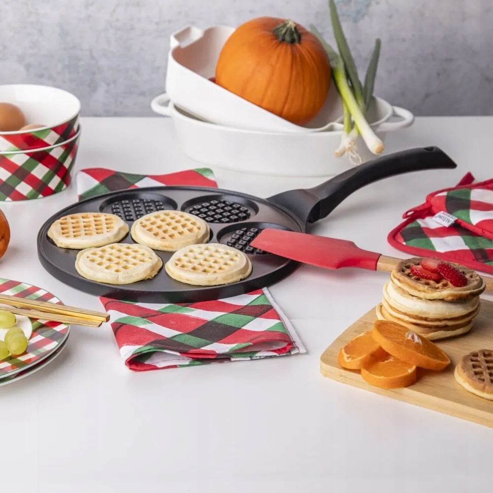 - Wielozadaniowa: patelnia zaprojektowana tak, byś mógł/a przyrządzać nie tylko doskonałe pancakes, ale także jajka, placki ziemniaczane i wiele innych pyszności