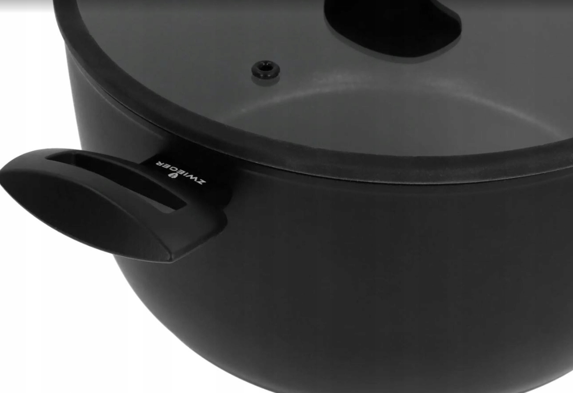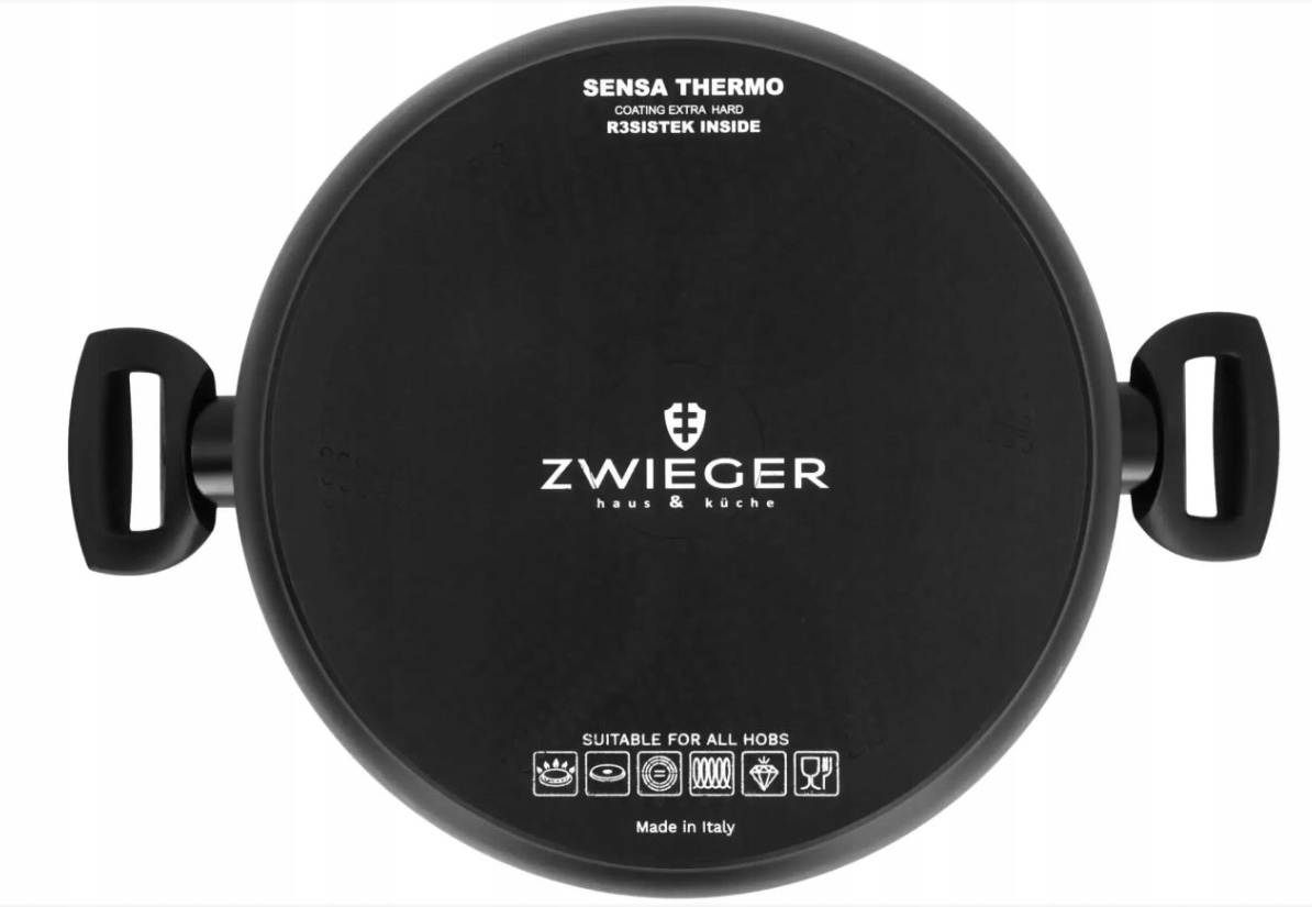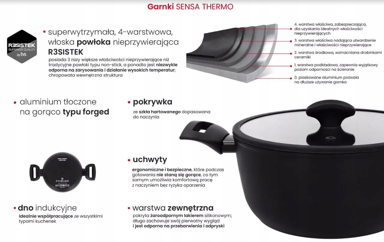 Garnek wykonany został z aluminium tłoczonego na gorąco typu forged. Warstwę wewnętrzną naczynia pokryto wyjątkowo odporną na ścieranie powłoką R3SISTEK. Jest to nowa jakość w dziedzinie powłok nieprzywierających – 4-warstwowa, nieprzywierająca, odporna na zarysowania powłoka powstała dzięki opracowaniu przełomowej technologii, którą jest specjalny proces utwardzania mineralnie jej środkowych warstw. Dzięki temu R3SISTEK oprócz doskonałych właściwości nieprzywierających charakteryzuje się niespotykaną twardością i odpornością na zarysowania. Górna warstwa powłoki pokryta jest odpornymi na ścieranie zgrubieniami, które ją zabezpieczają i sprawiają, że nawet metalowe narzędzia kuchenne płynnie przesuwają się po całej powierzchni. Dzięki swojej wyjątkowej grubości (>100 µm) powłoka R3SISTEK posiada 3 razy większe właściwości nieprzywierające w porównaniu do typowych powłok typu non-stick. Ponadto jest niezwykle odporna na działanie wysokich temperatur, dlatego poza zwykłym smażeniem umożliwia również przygotowywanie posiłków metodą bez tłuszczu. Na zewnątrz garnek pokryto żaroodpornym lakierem silikonowym, dzięki czemu warstwa ta jest odporna na przebarwienia i odpryski, a tym samym naczynie długo zachowuje swój pierwotny wygląd. Garnek Sensa Thermo równomiernie rozprowadza i akumuluje ciepło oraz idealnie współpracuje z wszystkimi rodzajami kuchenek, także indukcyjnymi. Naczynie posiada dopasowaną pokrywę ze szkła hartowanego oraz ergonomiczne i bezpieczne uchwyty, które podczas gotowania nie staną się gorące, co tym samym umożliwia komfortową pracę z naczyniem bez ryzyka oparzenia.