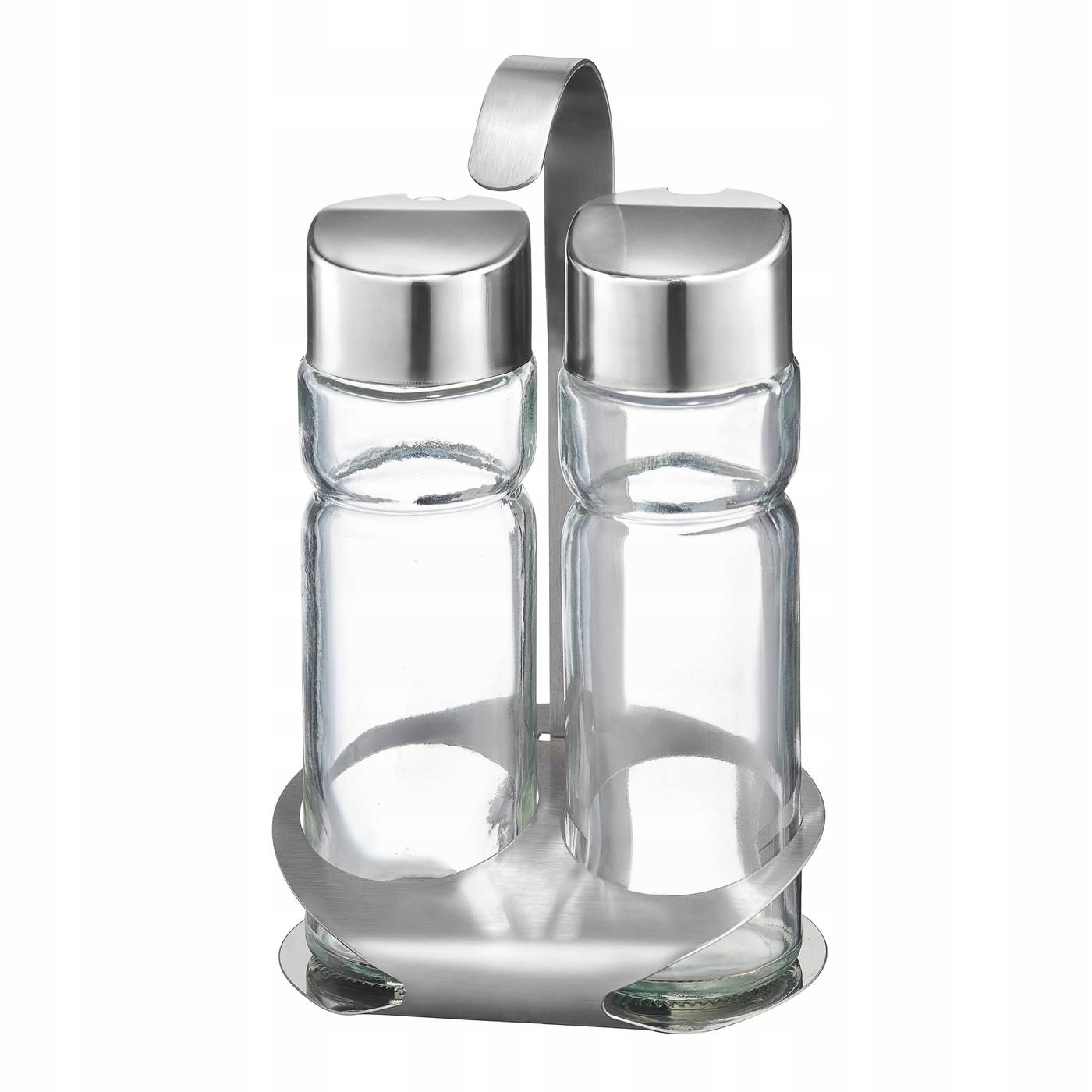 Nowoczesny 3-elementowy komplet przyprawników z wygodnym metalowym stojakiem. Komplet zawiera dwa pojemniki do octu i oliwy, które wykonane zostały z bezbarwnego szkła. Pojemniki zostały wyposażone w metalowe nakrętki z otworami, które ułatwiają ich użytkowanie. Szklany pojemnik gwarantuje higieniczne przechowywanie przypraw.