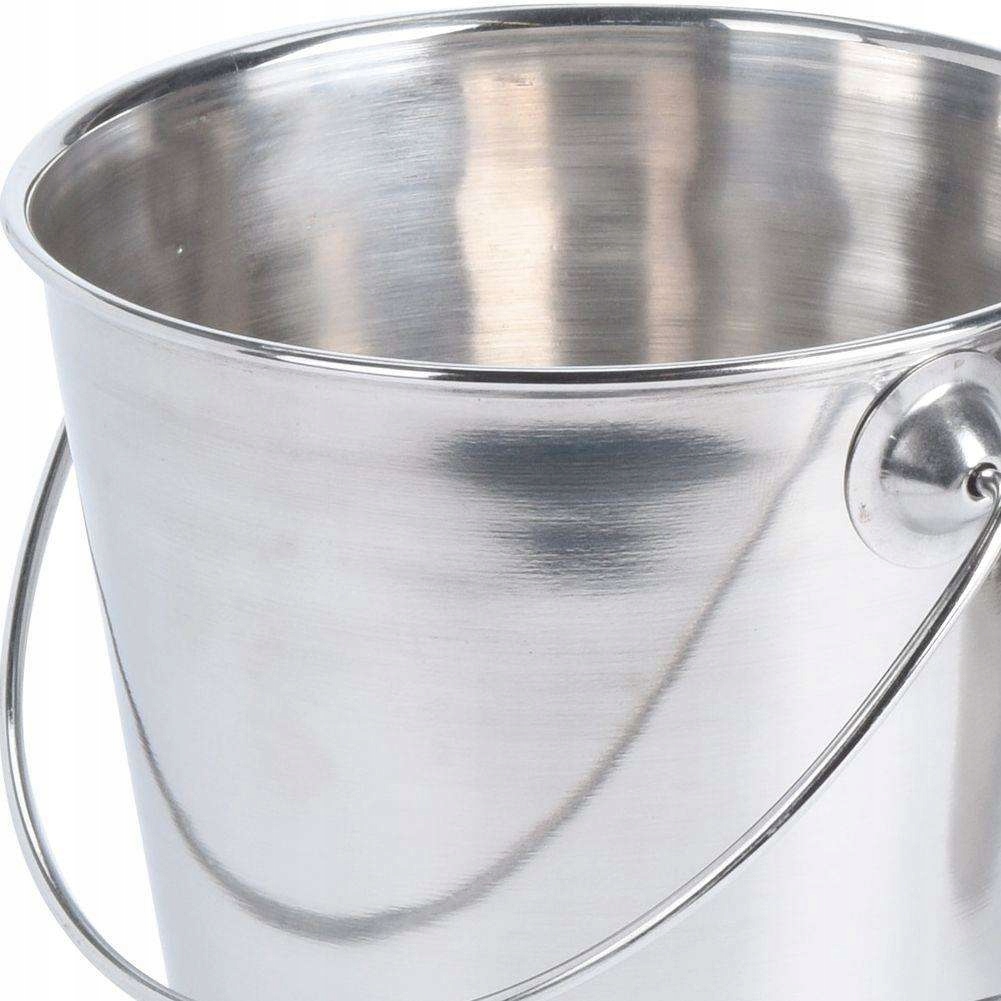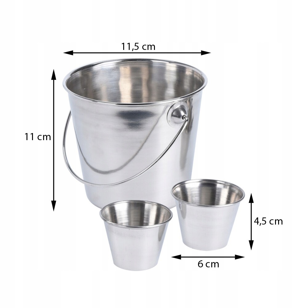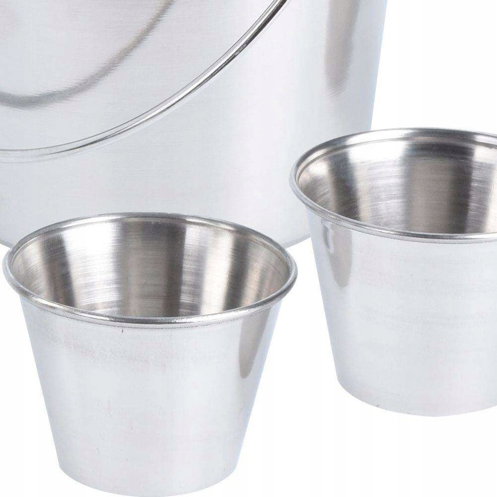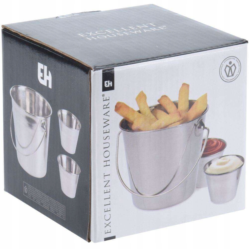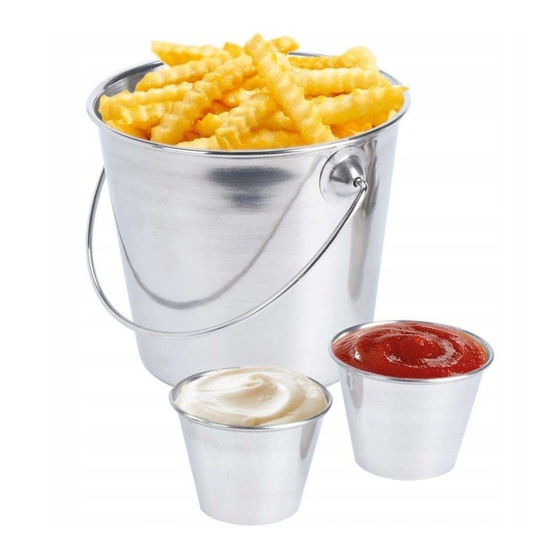 Stalowy pojemnik z uchwytem do podawania frytek oraz innych przekąsek, w zestawie z dwoma pojemniczkami na sosy